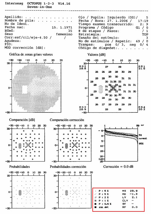 | A la derecha vemos ilustrado un informe impreso de un perímetro Octopus, en la parte inferior resaltado en el recuadro rojo los índices visuales |  |