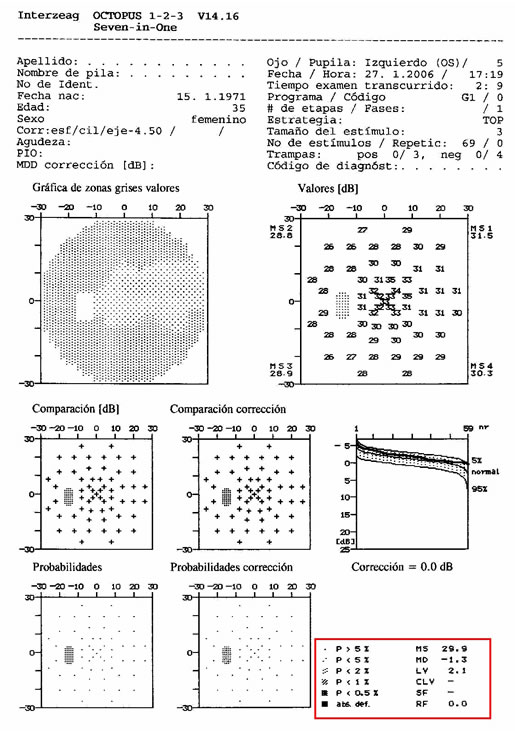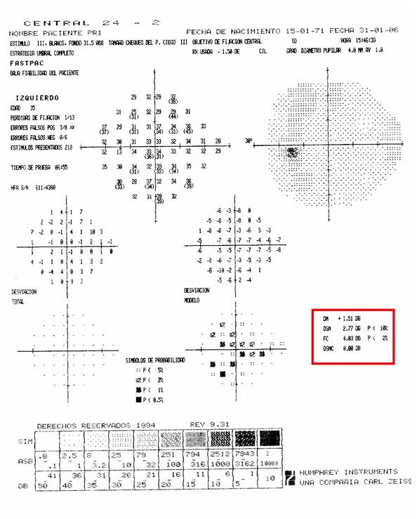 Vemos ilustrado a la derecha el informe impreso de un Humphrey con los índices en rojo resaltados |