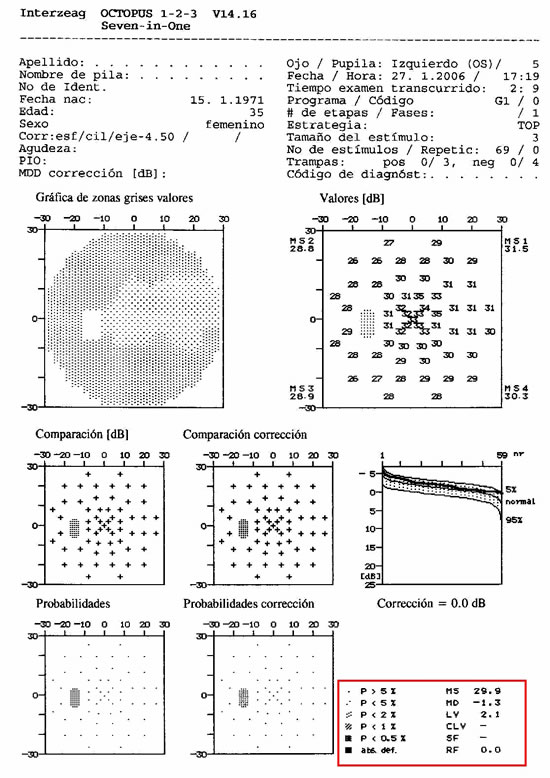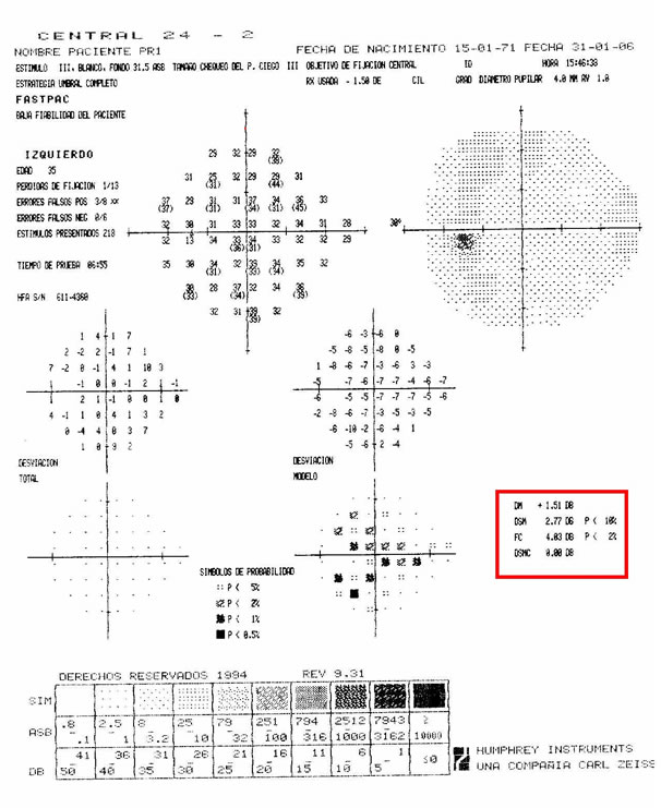| Vemos ilustrado a la derecha el informe impreso de un Humphrey con los índices en rojo resaltados | ![]() |